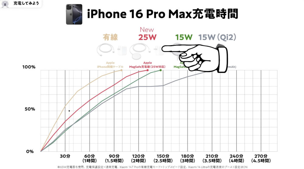 ちなみに、iPhone 16 Pro Maxを最新のMagSafe充電器(25W対応のもの)で充電した場合も2時間ちょいで100%になります。欲を言えば、Pixel 10 ProもProモデルなので25Wに対応して欲しかったですが、高速なワイヤレス充電を手に入れたい方はXLが良さそうです。