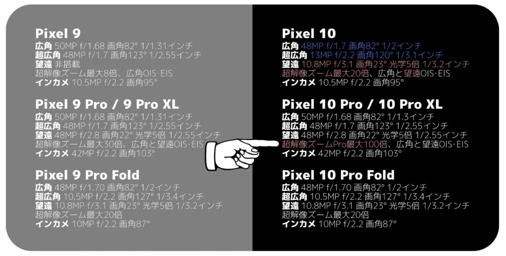 この夏は、これまで2眼カメラから望遠カメラを搭載し3眼カメラになった「Pixel 10」、「Pixel 10 Pro」「Pixel 10 Pro XL」は100倍ズームに対応した”超解像ズーム Pro”を搭載、さらに折りたたみの「 10 Pro Fold」の4モデルが登場。