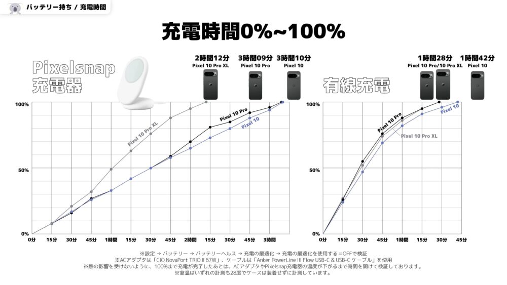 「Pixelsnap 充電器」を使って充電速度を計測したところ、0%から100%までにかかった時間は3時間9分でした。有線充電の場合は1時間28分と高速です。Pixel 10 Pro XLはPixelsnap(ワイヤレス)でも2時間12分とこの3機種の中では25Wに対応しているため、さらに高速に充電できます。