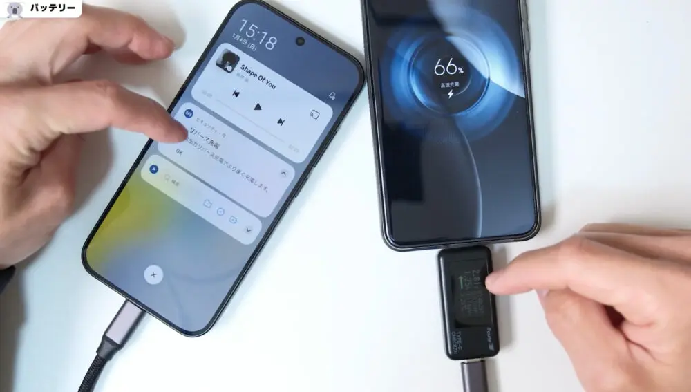 今回から22.5Wの有線リバース充電に対応。ケーブルを繋ぐだけでモバイルバッテリー代わりに使えます。しかも単に充電ができるだけでなく、高速にお裾分けできるのは助かります。