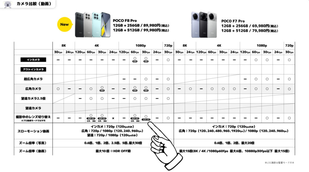 - 動画:最大10倍(F7 Proは15倍、Pixel 10は20倍まで可)